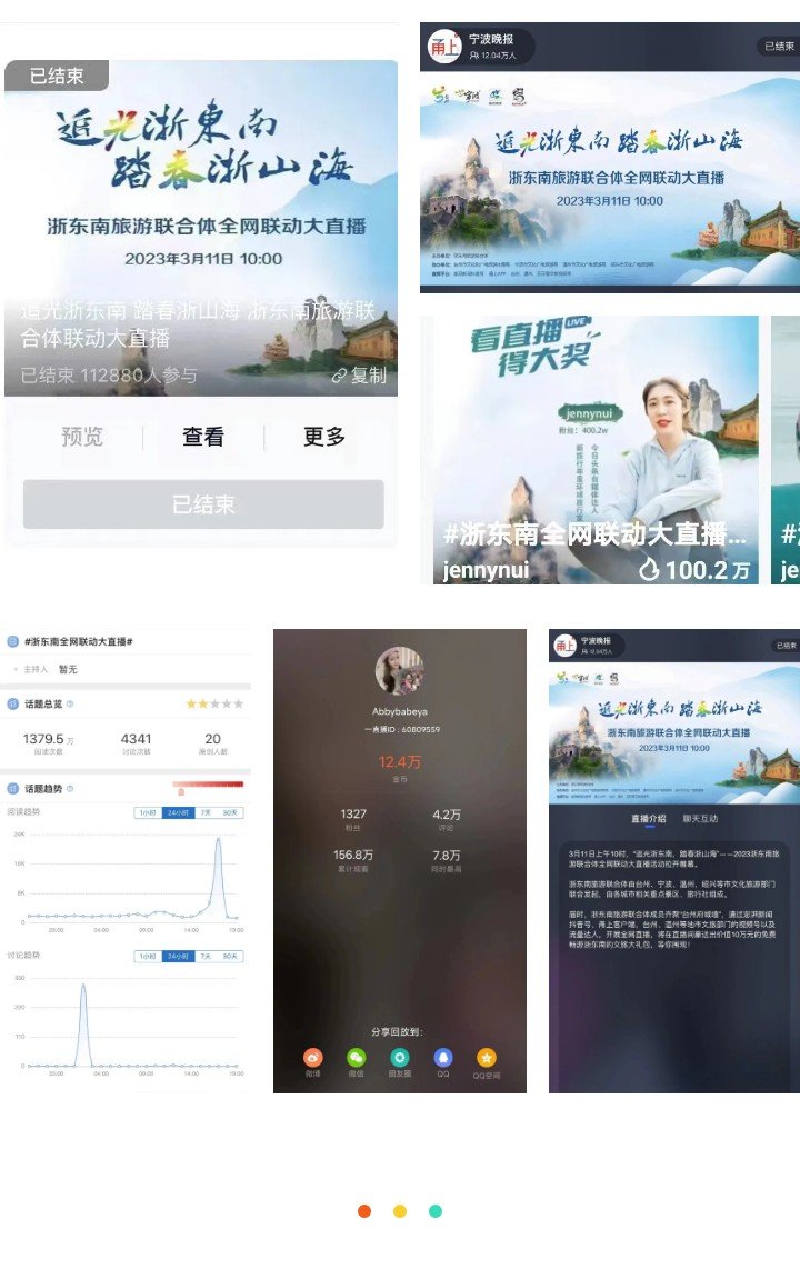 本次活动创新文旅推介模式,在台州府城巍峨耸峙的瓮城中沉浸式直播推介浙东南文旅资源,超11.2万网友在“澎湃新闻”抖音直播间参与互动,“甬上”APP、“台州、温州、玉环”文旅视频号以及文旅自媒体达人直播、微博话题等全网多平台总流量超1710.3万。在宣传浙东南文旅的同时得到了网友广泛好评,让浙东南“火”出了圈。